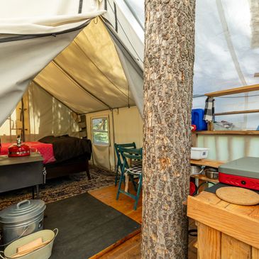 A cozy home in the air: bed, wood stove, and table inside: covered kitchen with dishes, camp stove, and propane outside... plus more!